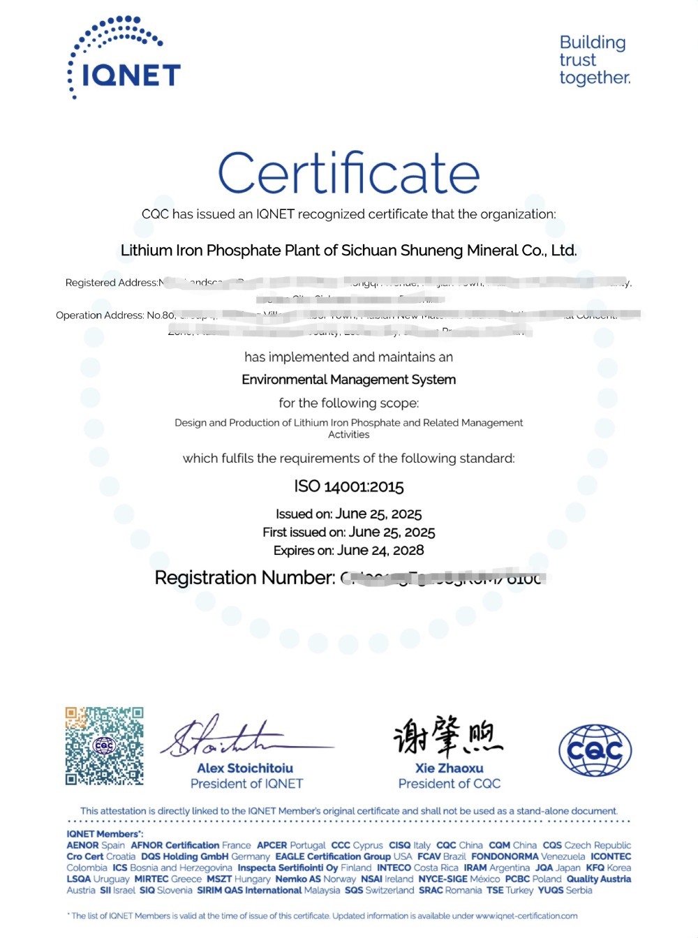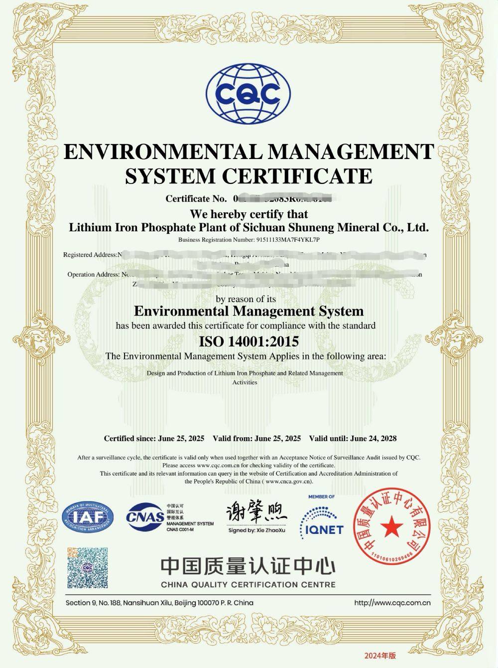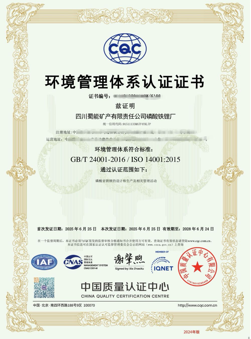 ? ? ? ?6月25日,蜀能礦產(chǎn)磷酸鐵鋰廠順利通過ISO14001環(huán)境管理體系認(rèn)證。ISO14001環(huán)境管理體系認(rèn)證,是指依據(jù)ISO14001標(biāo)準(zhǔn)由第三方認(rèn)證機(jī)構(gòu)實(shí)施的合格評(píng)定活動(dòng)。ISO14001是由國(guó)際標(biāo)準(zhǔn)化組織發(fā)布的一份標(biāo)準(zhǔn),是ISO14000族標(biāo)準(zhǔn)中的一份標(biāo)準(zhǔn),該標(biāo)準(zhǔn)于1996年進(jìn)行首次發(fā)布,2004年分別由ISO國(guó)際標(biāo)準(zhǔn)化組織對(duì)該標(biāo)準(zhǔn)進(jìn)行了修訂,最新版本為ISO14001-2015。