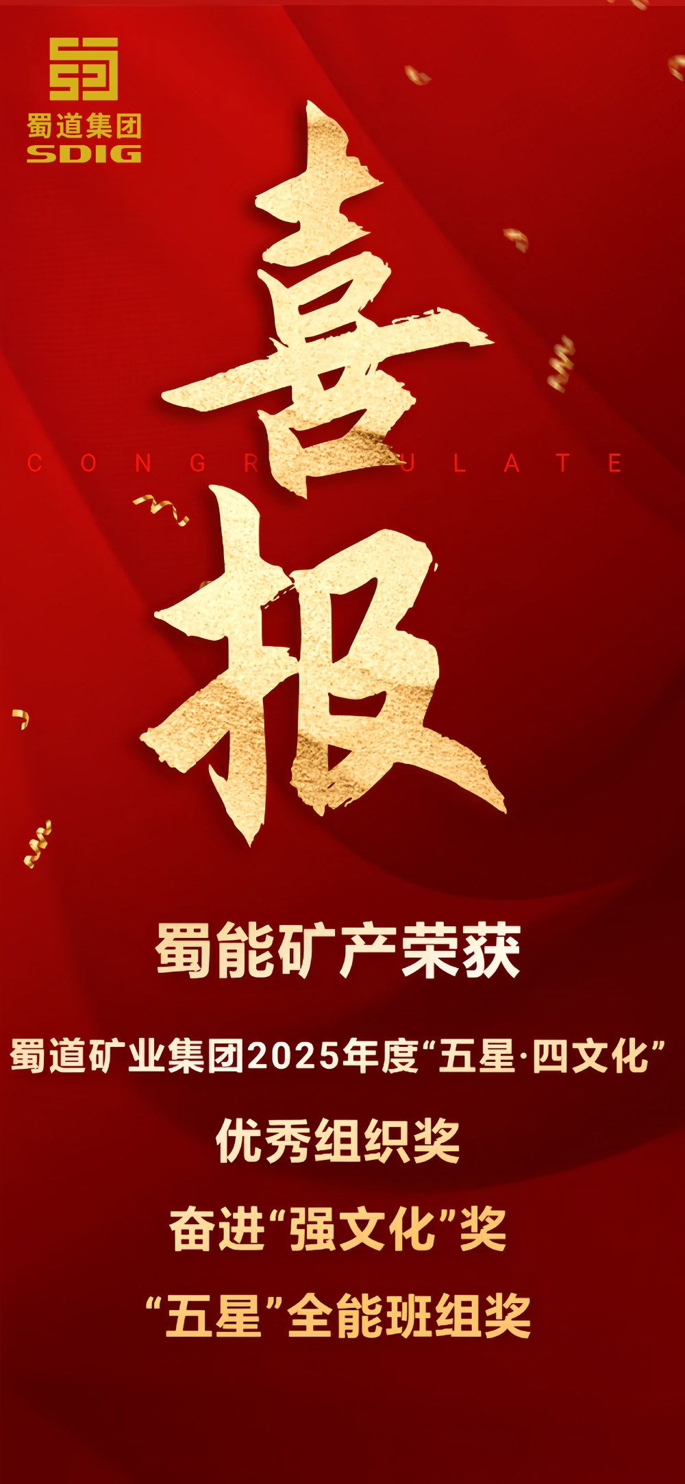 喜報!蜀能礦產(chǎn)榮獲蜀道礦業(yè)集團2025年度“五星·四文化”優(yōu)秀組織獎、奮進“強文化獎”、“五星”全能班組獎