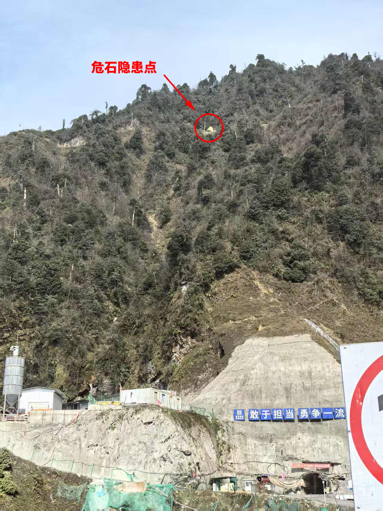 ? ? ? ?2月19日(農(nóng)歷正月初三),三號(hào)礦山值班人員在日常巡查中發(fā)現(xiàn)通往大風(fēng)頂自然保護(hù)區(qū)門口約200米處道路旁存在一處大型危巖風(fēng)險(xiǎn)隱患,三號(hào)礦山生產(chǎn)副礦長(zhǎng)支小龍、安全副礦長(zhǎng)唐太平迅速組織值班值守的專業(yè)技術(shù)人員進(jìn)行現(xiàn)場(chǎng)勘察,查明該危巖系大風(fēng)頂自然保護(hù)區(qū)道路邊坡失穩(wěn)后滾落形成,體積約125立方米、重約300余噸,危巖一側(cè)凌空擱置于公路邊沿,受降雨、融雪或外力干擾極易滑移傾覆,對(duì)下游村民、過(guò)往行人及三號(hào)礦山1645工業(yè)場(chǎng)地構(gòu)成嚴(yán)重威脅。